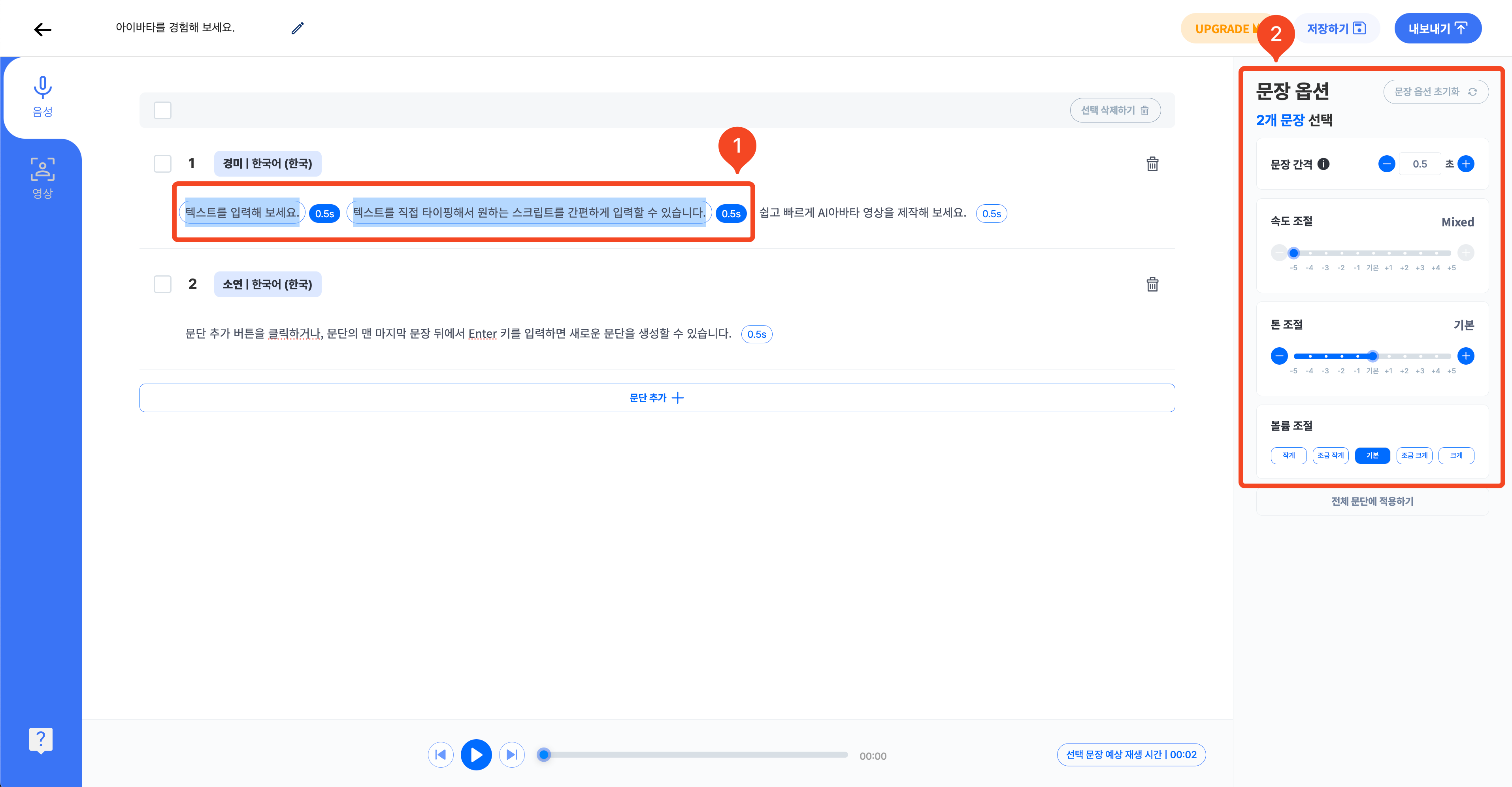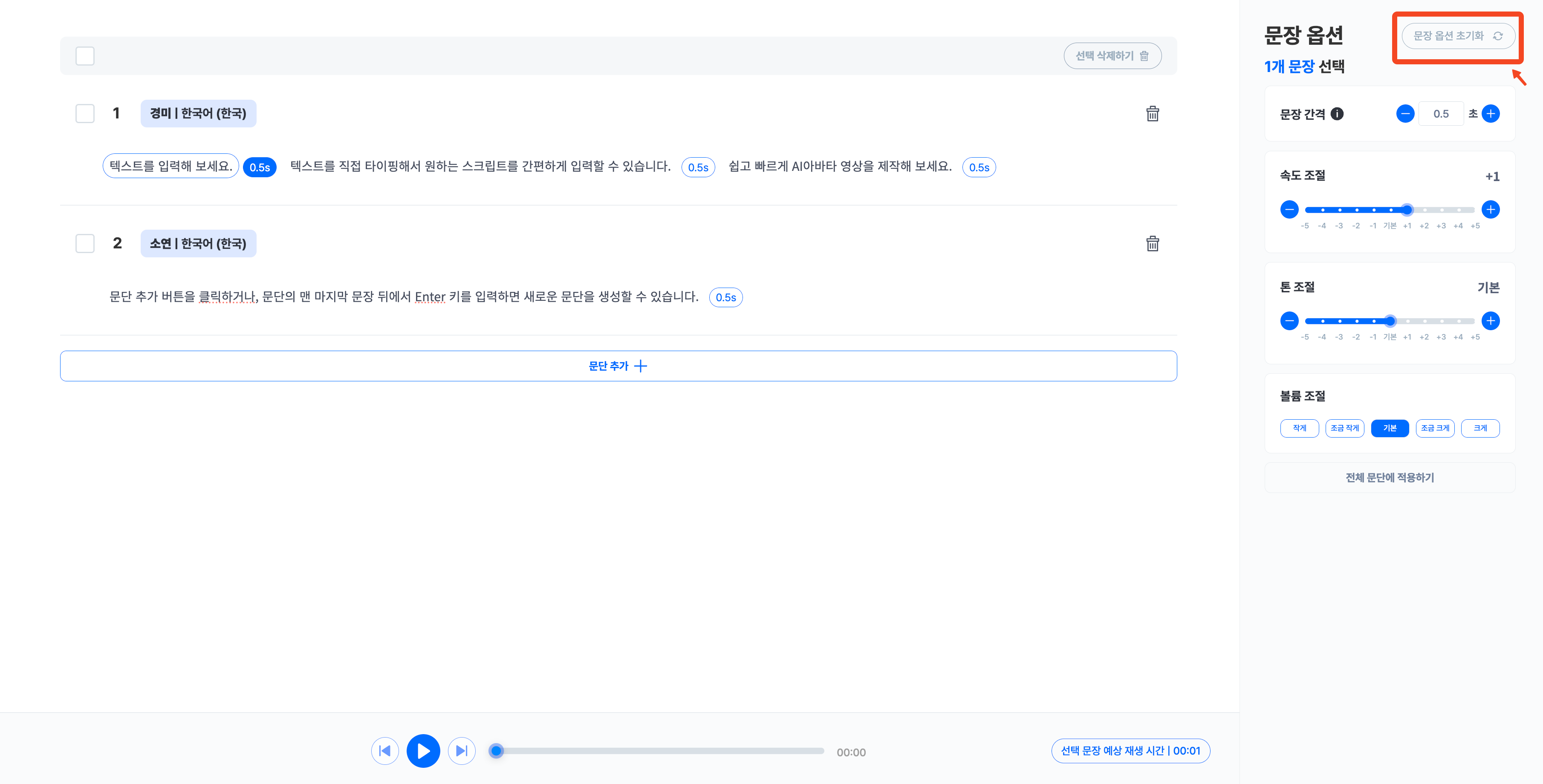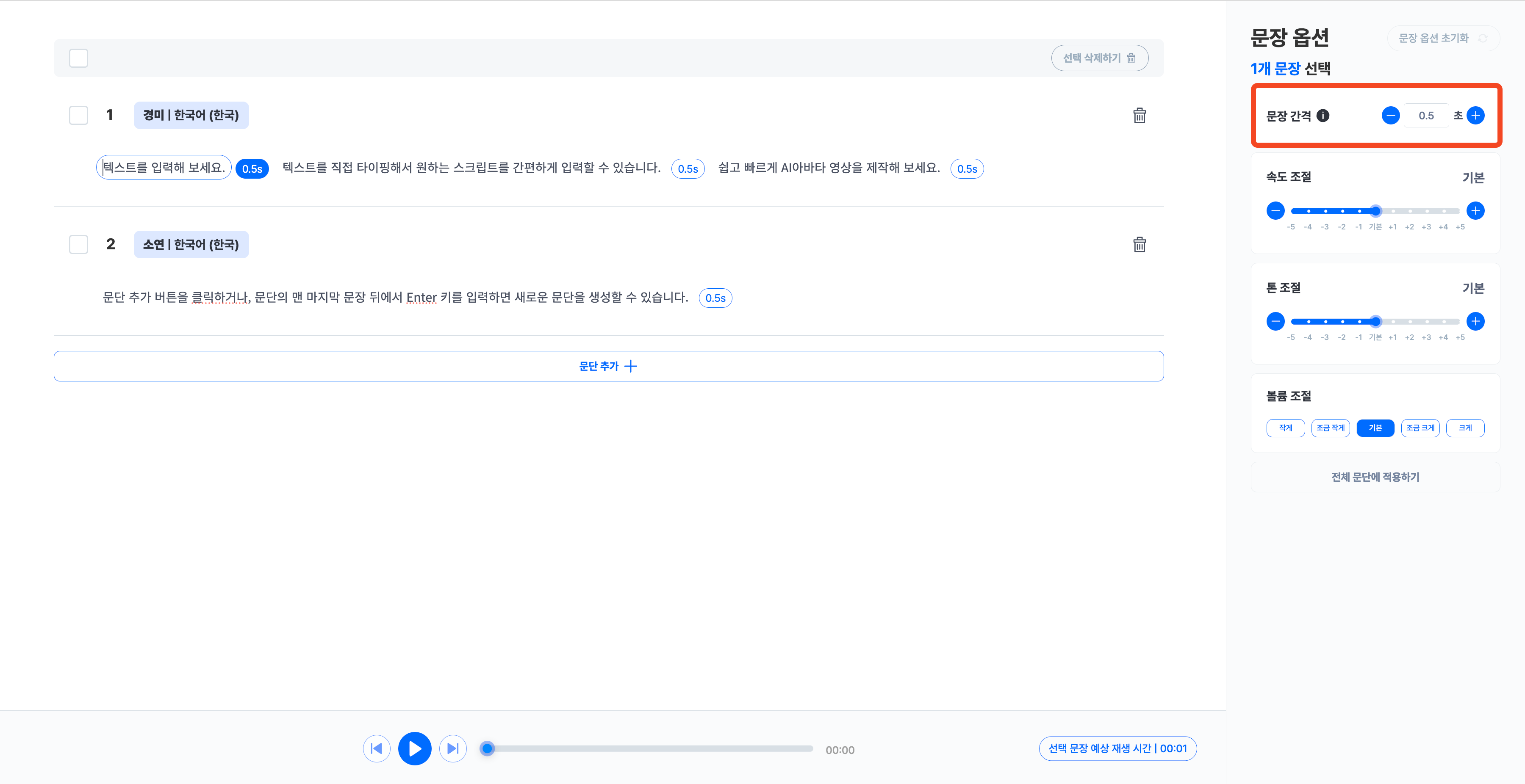 예를 들어, 첫 번째 문장을 선택한 후 문장 간격 조절값을 0.7로 설정하면, AI음성은 첫 번째 문장을 읽고 0.7초 공백을 두고 두 번째 문장을 읽습니다.