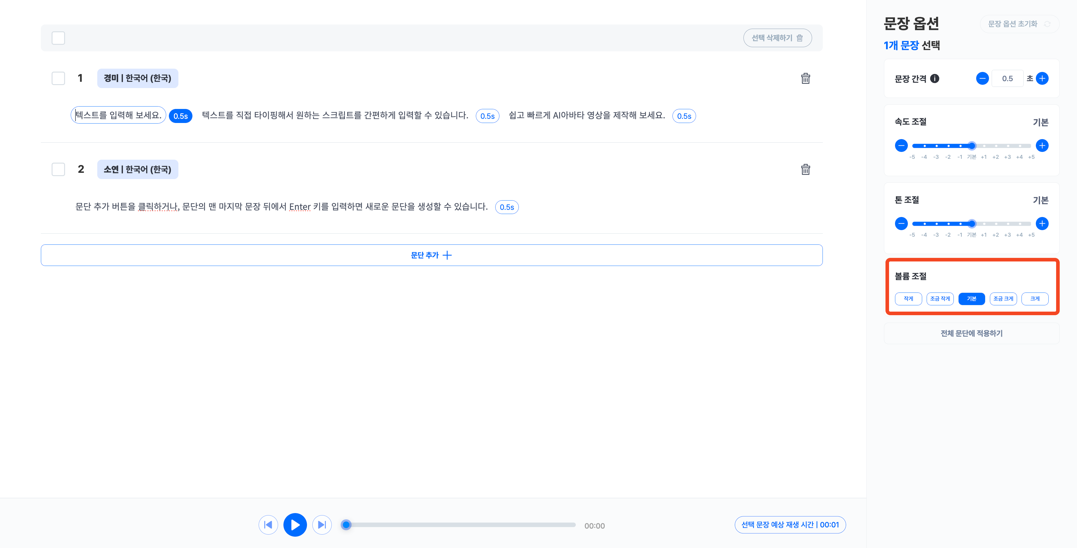 볼륨 조절은 목소리를 크거나 작게 조절할 수 있는 옵션입니다. 다양한 목적에 맞게 선택한 문장마다 목소리 볼륨을 조절하여 하나의 음성 파일로 추출할 수 있습니다.