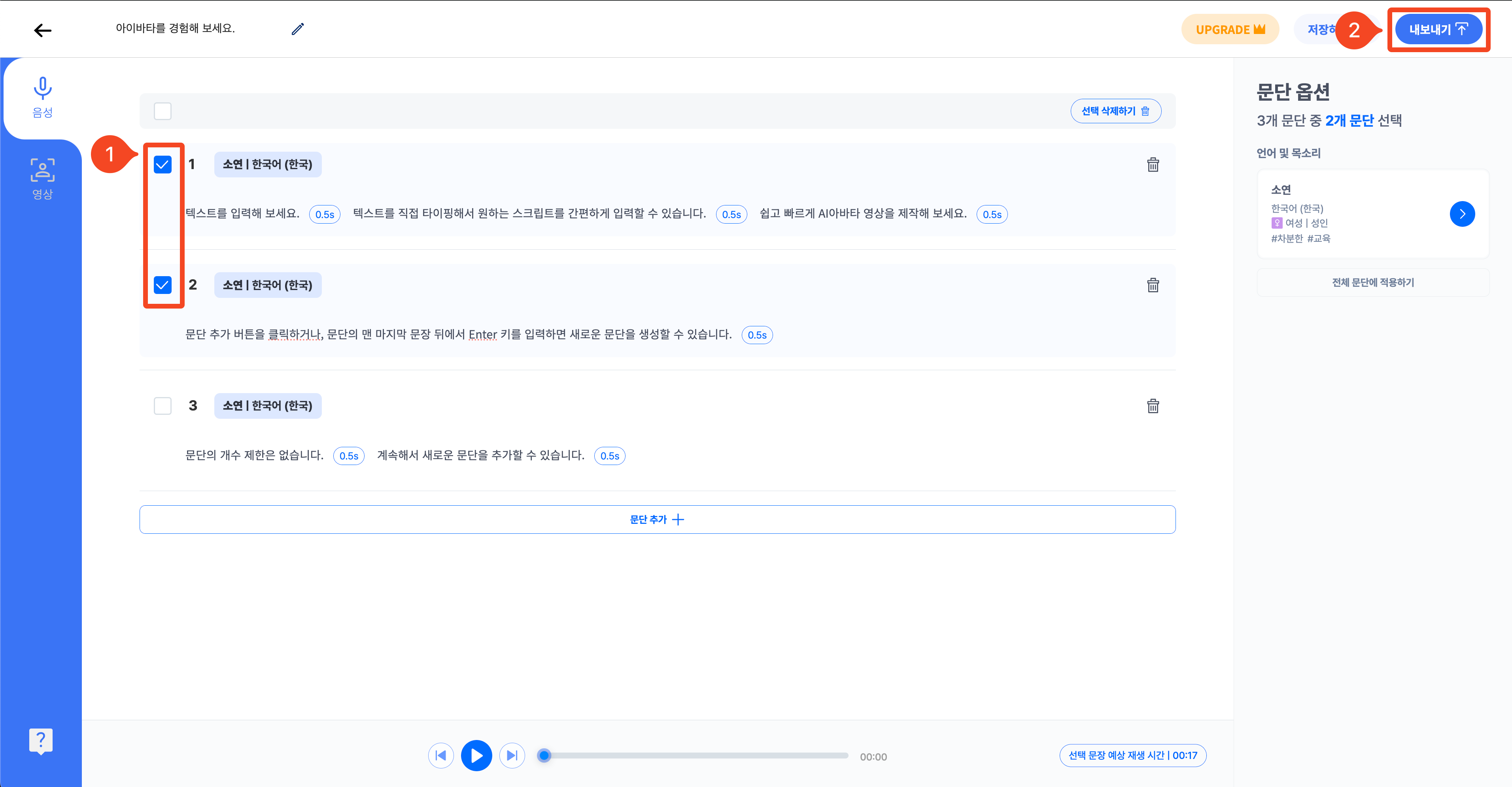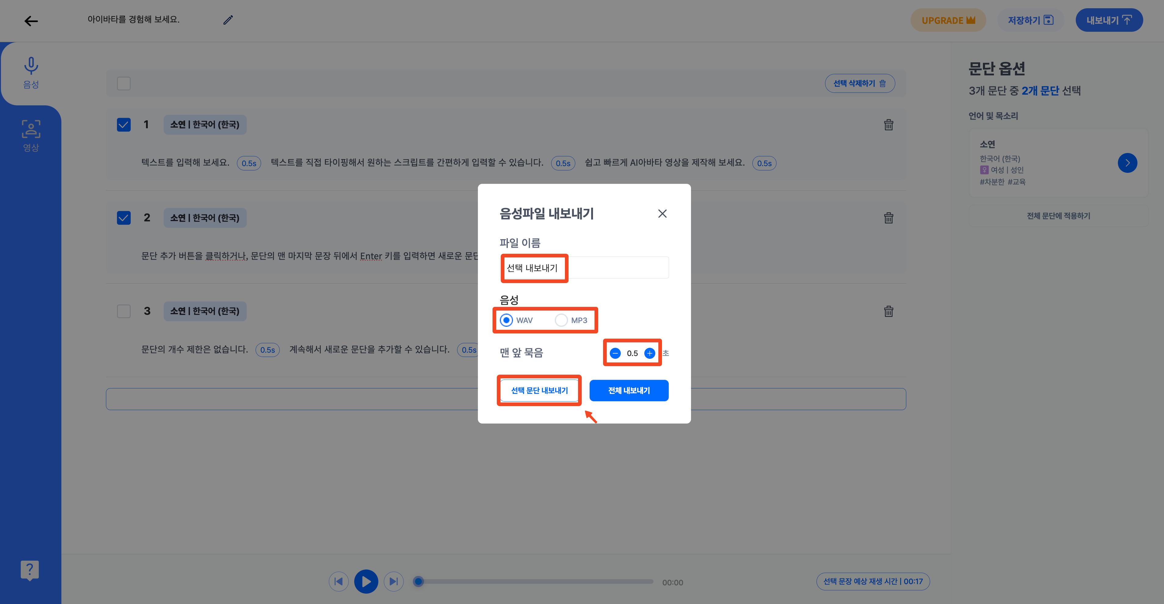7. <mark style="color:blue;">`선택 내보내기`</mark> 버튼을 클릭하면 선택한 문단만 하나의 음성 파일로 내보내기할 수 있습니다.