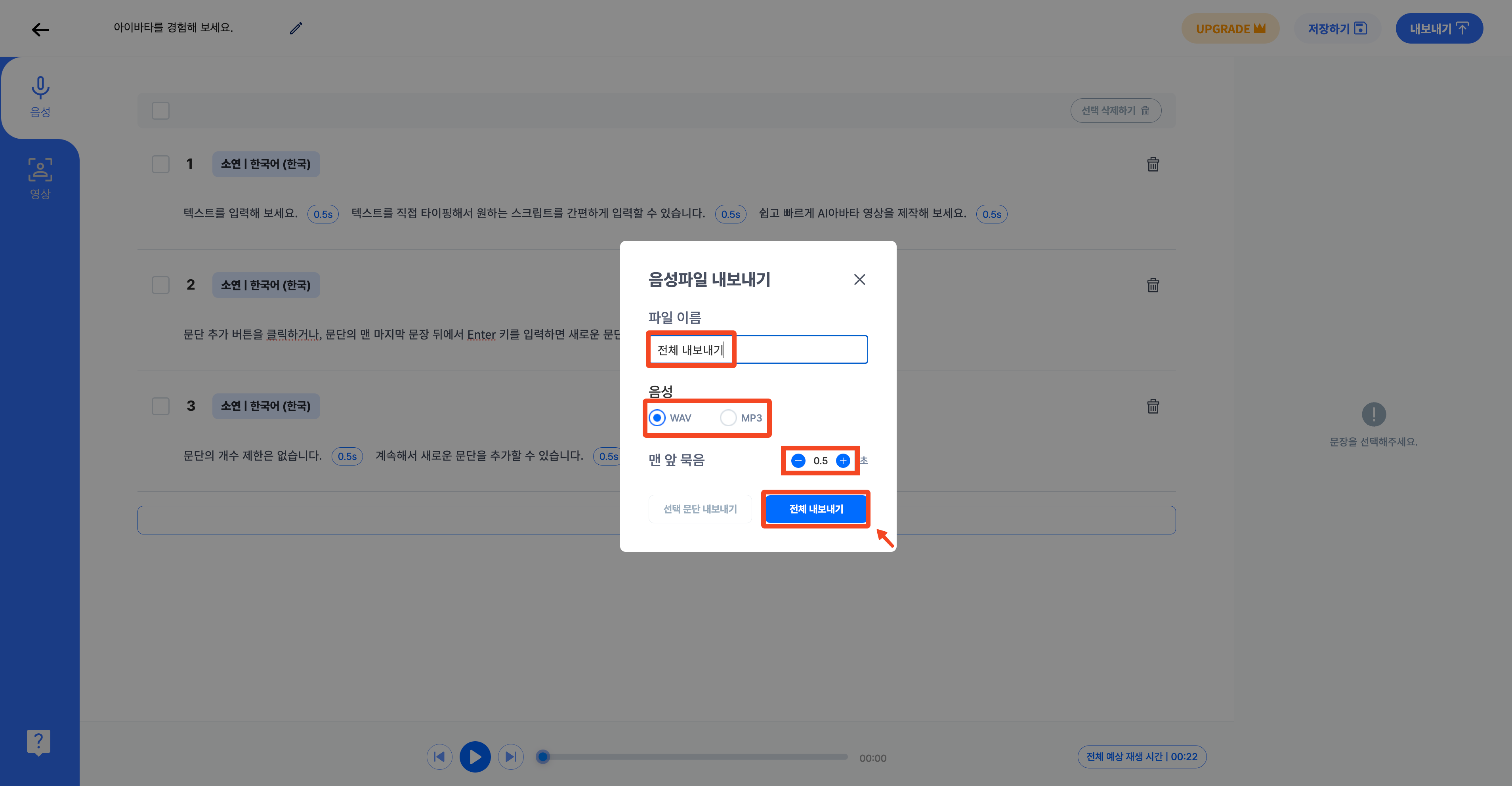 5. <mark style="color:blue;">`전체 내보내기`</mark> 버튼을 클릭하면 에디터 영역 내 모든 문장을 하나의 음성 파일로 내보내기할 수 있습니다.