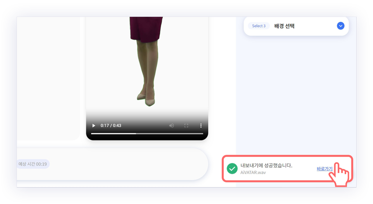 내보내기를  성공하면 우측 하단에 알림 메세지가 팝업됩니다. <mark style="color:blue;">`바로가기`</mark>를 클릭하면[`내보내기 내역`](https://aivatar.gitbook.io/user-guide/ko/usage/using-aivatar/dashboard/export-list)으로 이동합니다.